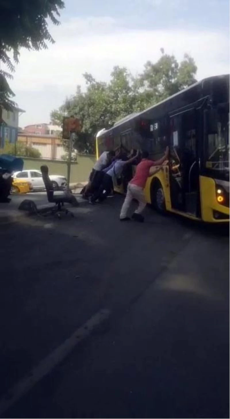 İETT Otobüsü yolda asılı kaldı, vatandaşlar kurtarmak için seferber oldu