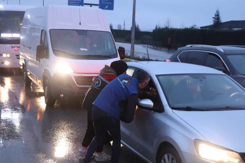 Düzce Belediyesi, Ramazan ayının ilk gününde iftara yetişemeyenlere trafik ışıklarında su, hurma ve sandviç dağıttı.