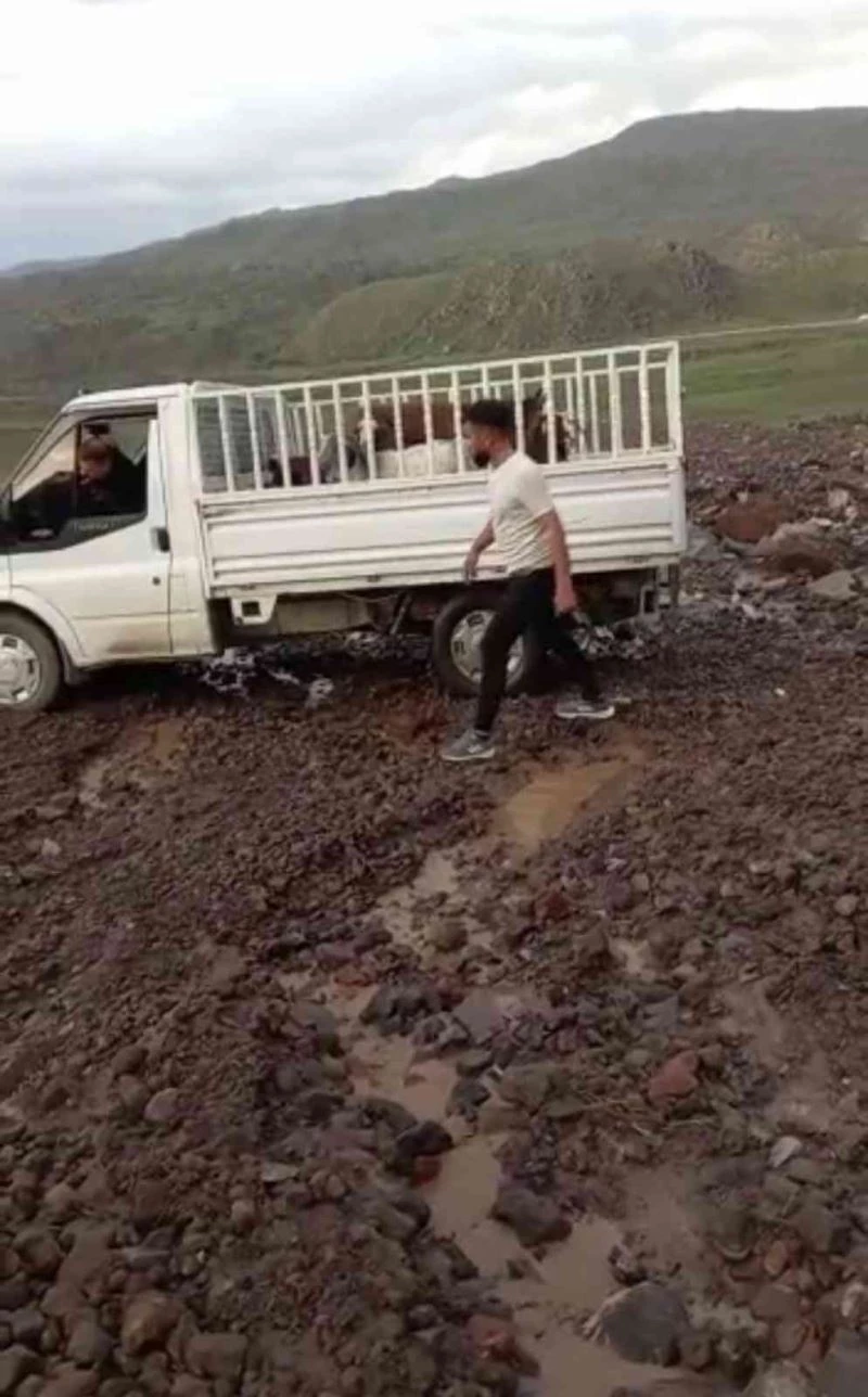 Iğdır’da sağanak yağış sonrası yaşanan sel nedeniyle köy yolu kapandı, iki araç mahsur kaldı.