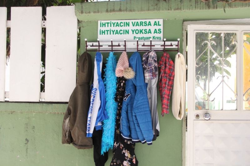“İhtiyacın varsa al, ihtiyacın yoksa as” sloganıyla yola çıkan ve 2 çocuk annesi olan Tülay Duran Bayrak, insanların kullanmadığı, istemediği ya da artık hoşumuza gitmeyen kıyafetlerinin ihtiyacı olan kişilere ulaştırılması için bir alan oluşturdu. Kreşin duvarında yağmura karşı koruma sağlayan bir alan belirleyen Bayrak, ilk kıyafetleri de kendi astı. 10 ay önce başlayan proje veliler ve çevredekilerin de desteğiyle büyüdü ve yüzlerce kişiye ulaştı. Askılıkta çocuk ve yetişkin kıyafetlerinden çanta ve şapka gibi aksesuarlara kadar çeşitli eşyalar yer almaya başladı. Örnek teşkil eden bu uygulama insanlar tarafından takdir topladı.