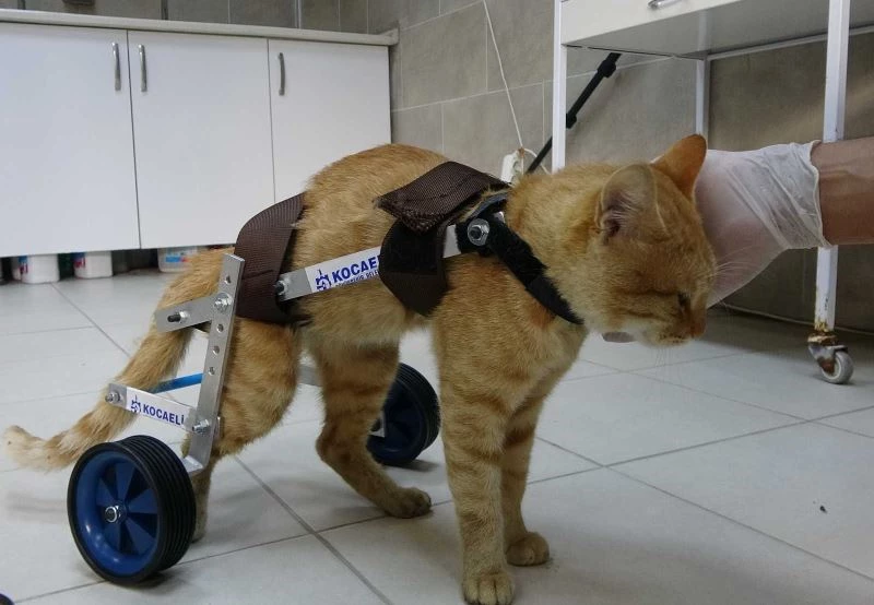 Kocaeli’de arabanın çarpmasıyla arka iki bacağı felç kalan ve yürüyemeyen kediye, özel yürüteç yapıldı. Yeniden hayata tutunan kedi şimdilerde koşuyor.