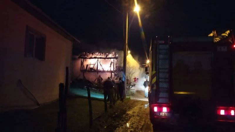 Sakarya’nın Karasu ilçesinde ahır ve samanlık olarak kullanılan iki katlı ahşap yapı alev alev yandı. Yangında ahır ve samanlık kullanılamaz hale geldi.