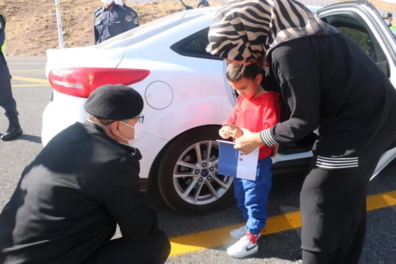 Kayseri İl Jandarma Komutanlığı tarafından Erciyes yolunda trafik denetimi gerçekleştirildi. Ekipler denetim kapsamında araçları tek tek durdurarak, trafik güvenliği konusunda sürücülere uyarılarda bulundu. Kadın jandarma personelleri ise sürücülere şeker ve kolonya ikram ederken, çocuklara da kırmızı düdük ile boyama kitabı hediye etti.