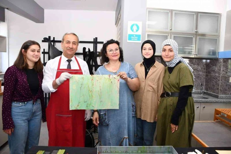 10. sınıf öğrencileri Berra Boz ve Sezen Kaba’nın müzik dinletisi eşliğinde 9. sınıf öğrencileri Ceylin Naz Demir, Zeynep Sueda Demir ve Elif Beyza Albaş’ın ebru sanatı eserlerinden oluşan sergiyi tek tek gezen Akbaş, usta öğretici Didem Meriç Karpuz’dan ebru sanatı ve sergi hakkında bilgi aldı.