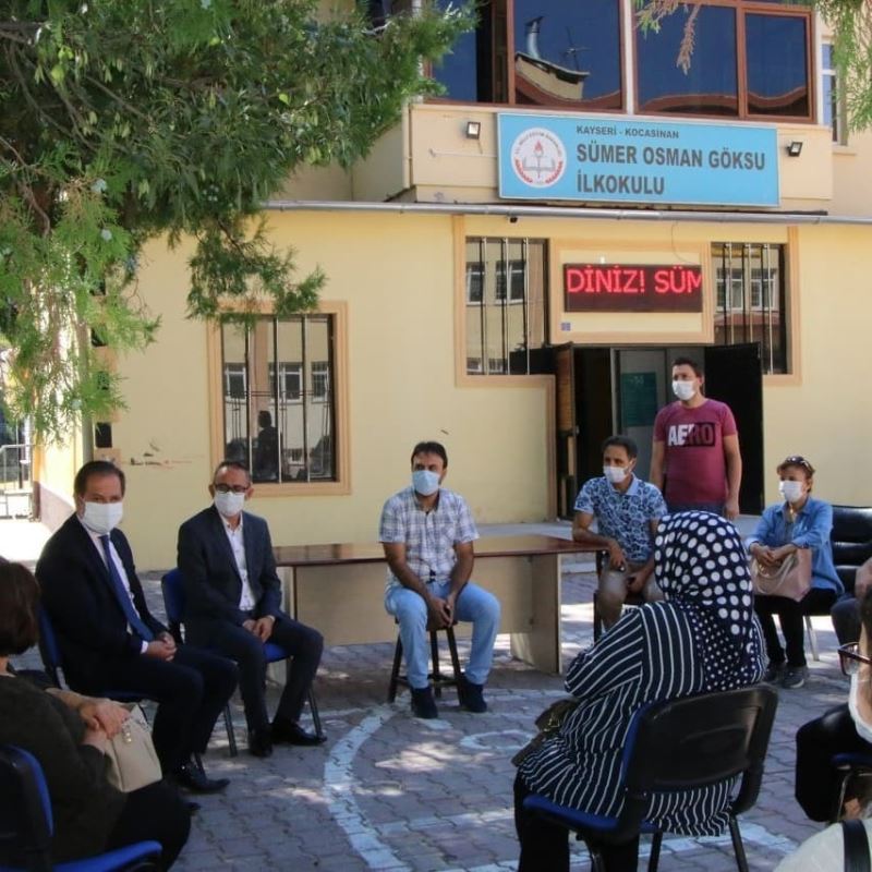Okulun bahçesinde maske ve sosyal mesafe gözetilerek gerçekleştirilen ziyarette, Milli Eğitim Müdürü Ekinci seminer çalışmaları ve okuldaki diğer çalışmalarla ilgili olarak bilgiler aldı.