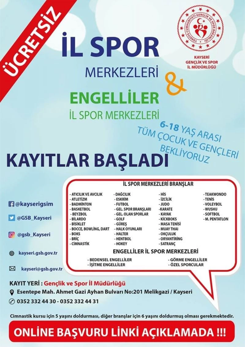 Kayseri Gençlik ve Spor İlMüdürlüğü tarafından düzenlenecek olan İl Spor Merkezleri ve Engelliler İl Spor Merkezleri için kayıtlar online olarak başladı.