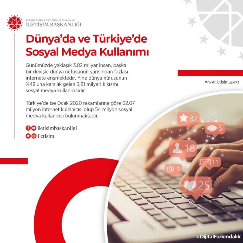 İletişim Başkanı Fahrettin Altun, #DijitalFarkındalık etiketiyle yaptığı paylaşımda, “dünyada ve Türkiye’de sosyal medya kullanımı”, “dijital farkındalık ve siber vatan”, “dijital vatandaş”, “dijital diplomasi”, “dijital algı yönetimi”, “siber güvenlik” ve “yapay zeka” konularından bilgi kartlarına yer verdi. Dijital Dünya’da 5’ten büyük olduğunu vurgulayan Altun, şunları kaydetti: