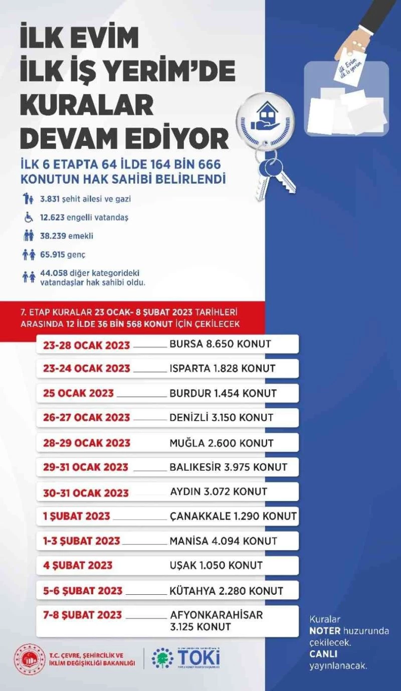 7’nci etap kuraları da 12 ilde 8 Şubat 2023’e kadar devam edecek. 12 ilde gerçekleştirilecek 36 bin 568 hak sahibi için illere göre dağılım ve kura tarihleri ise şu şekilde açıklandı: