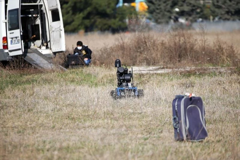 Bomba uzmanları, boş bir araziye bırakılan şüpheli çantayla ilgili tatbikatında da robotla ön inceleme yaptı.