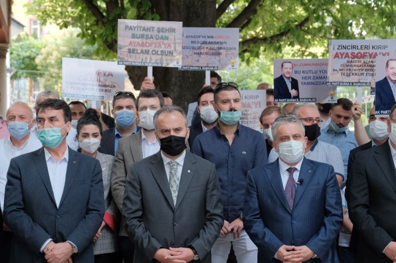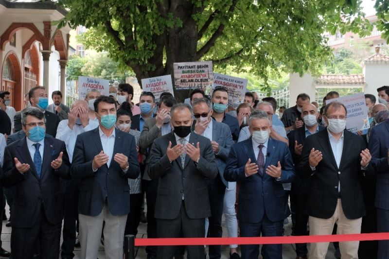 Danıştay 10. Dâiresi’nin 24 Kasım 1934 tarihli Bakanlar Kurulu kararını oy birliğiyle iptâl etmesi ve ardından Cumhurbaşkanı Recep Tayyip Erdoğan’ın yayınladığı kararnameyle 86 yıl sonra Ayasofya’nın tekrar camiye çevrilmesi, Osmanlı’nın ilk başkenti Bursa’da da büyük sevinçle karşılandı. Osmanlı Devleti’nin kurucuları Osman Gazi ve Orhan Gazi türbelerinin bulunduğu Tophane Meydanı’nda toplanan Bursalılar, mehter takımının konseriyle coşku yaşadı. AK Parti Bursa İl Başkanlığı’nın düzenlediği törene, Büyükşehir Belediye Başkanı Alinur Aktaş, İl Başkanı Ayhan Salman, Bursa Milletvekilleri Hakan Çavuşoğlu, Refik Özen, Ahmet Kılıç, Mustafa Esgin, Vildan Yılmaz Gürel, belediye başkanları, parti teşkilatlarının üyeleri ve çok sayıda vatandaş katıldı. Program öncesinde Osman Gazi ve Orhan Gazi türbeleri protokol mensupları tarafından ziyaret edilerek dua edildi.