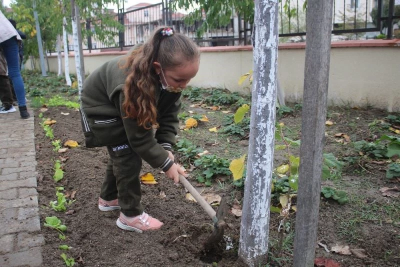 Büyükşehir Belediyesi İsmet İnönü İlkokulu yönetimi ve Okul Aile Birliği’nin çalışmalarıyla okul bünyesine kazandırılan uygulama bahçesine sezonun ilk bitkileri ekildi. Okul Müdürü Murat Bekdaş önderliğinde gerçekleştirilen ekimlerde 1. ve 2. sınıf öğrencileri pandemi kurallarına uygun ekim yaptı. Yapılan ilk ekimde bahçeye kıvırcık, ıspanak, karnabahar, brokoli, karalahana ve pırasa, arpacık soğan, sarımsak, bakla, bezelye ve maydanoz ekilerek kış mevsimine hazırlık yapıldı. Önce toprağı havalandıran öğrenciler, ekim için uygun vaziyete getirdiler. Kendi kazdıkları ve çapaladıkları toprağa ekim gerçekleştiren öğrenciler, toprakla uğraşmaktan büyük mutluluk duyduklarını ifade ettiler.