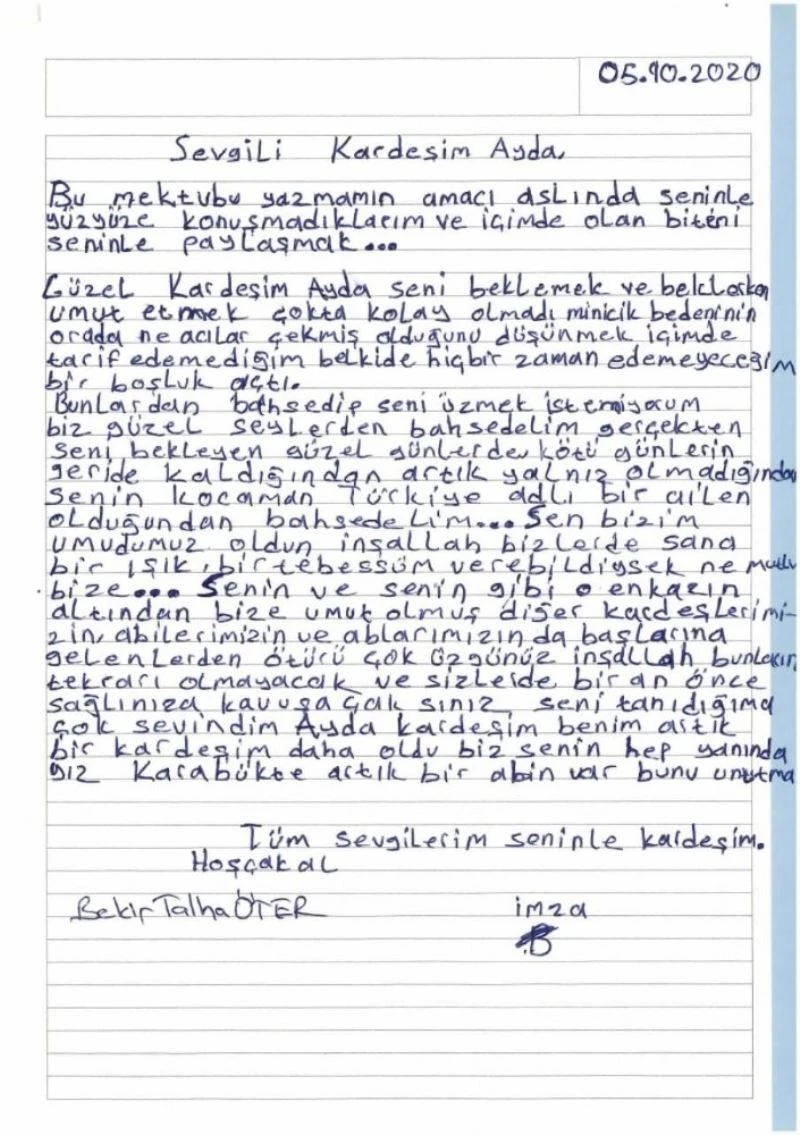 İlkokul öğrencisi Bekir Talha Öter ise mektubu yazmasının amacının içinde olan biteni Ayda bebekle paylaşmak olduğunu belirterek, “Güzel kardeşim seni beklemek ve beklerken umut etmek çok da kolay olmadı. Minicik bedeninin orada ne acılar çekmiş olduğunu düşünmek içimde tarif edemediğim belki de hiçbir zaman edemeyeceğim bir boşluk açtı. Bunlardan bahsedip seni üzmek istemiyorum. Biz güzel şeylerden bahsedelim. Gerçekten seni bekleyen güzel günlerden. Artık yalnız olmadığından ve senin kocaman Türkiye adlı bir ailen olduğundan bahsedelim. Sen bizim umudumuz oldun. İnşallah bizler de sana bir ışık, bir tebessüm verebildiysek ne mutlu bize. Senin ve senin gibi o enkazın altından bize umut olmuş diğer kardeşlerimizin abilerimizin ablalarımızın da başlarına gelenlerden ötürü çok üzgünüz. İnşallah bunları tekrarı olmayacak ve sizlerden bir an önce sağlığınıza kavuşacaksınız. Seni tanıdığıma çok sevindim Ayda kardeşim benim. Artık bir kardeşim daha oldu. Biz senin hep yanındayız, Karabük’te artık bir ağabeyin var bunu unutma” ifadelerine yer verdi.