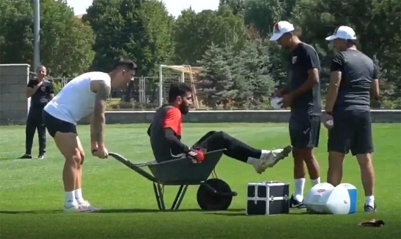 Süper Lig 2020-2021 futbol sezonu hazırlıklarını tesislerinde sürdüren Hes Kablo Kayserispor antrenmanında zaman zaman oldukça ilginç anlar görüntüleniyor. Bugün gerçekleştirilen antrenmanda hafif sakatlık geçiren kaleci İsmail Çipe, sedye yerine el arabası ile saha kenarına alındı.
