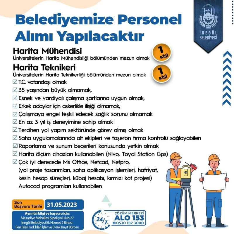 “Kurumumuz bünyesinde istihdam edilmek üzere 2 personel alımı yapılacak. İlçe halkımıza en iyi hizmeti sunmak adına yapılan alım çerçevesinde; 1 harita mühendisi ile 1 harita teknikeri istihdam edilecek. Başvuruda bulunmak isteyen vatandaşlarımızın 31 Mayıs 2023 Çarşamba günü 17.00’a kadar Mesudiye Mahallesi Şipali Yolu No:27 İnegöl Belediyesi Ek Hizmet-2 adresinde bulunan Fen İşleri Müdürlüğü İdari İşler ve Evrak Kayıt Bürosuna bizzat başvurmaları gerekmektedir.”