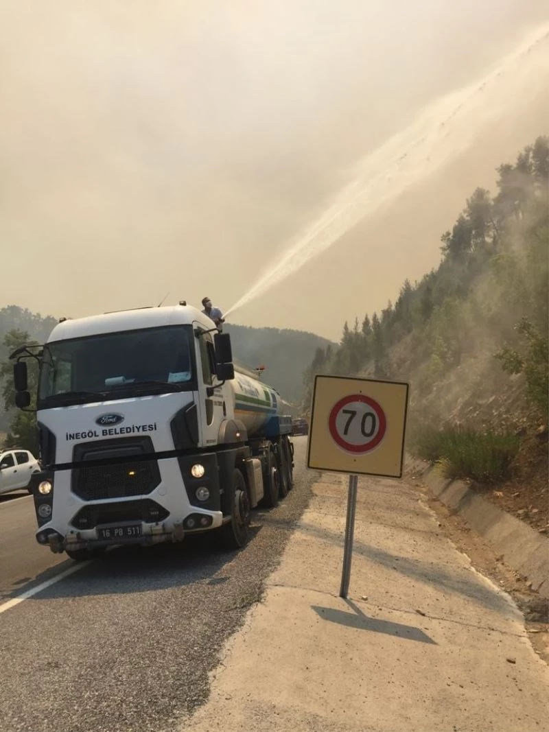 İnegöl Belediyesi, bölgeye hafta sonu araç ve ekipman sevk ederek çalışmalara katılmıştı. İnegöl ekibi, Manavgat’ta yurdun diğer bölgelerinden gelen ekiplerle birlikte alevlerle mücadelesini sürdürüyor. Pazar günü Başkan Alper Taban’ın talimatlarıyla İnegöl’den 20 tonluk tanker ve 2 personel ile hareket eden İnegöl Belediyesi ekibi, akşam saatlerinde Manavgat’a ulaşmıştı. Pazar akşamından bu yana ekibin ilgili birimler koordinesinde Manavgat bölgesinde yangınla mücadelesi sürüyor.