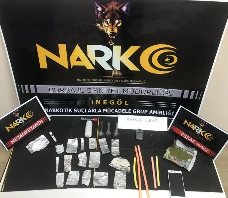 Edinilen bilgiye göre, İnegöl Narkotik Suçlarla Mücadele Grup Amiriliği ekipleri tarafından Uyuşturucu Satışı Yaptığı bilgisi üzerine, A.Ş. isimli şahsı takibe alındı. Şahıs Turgutalp Mahallesi Yılmaz Sokak üzerinde araç ile gezdiği sırada ekipler tarafından durduruldu. R.G. İsimli şahıs ile birlikte yakalandı. Şahıslar ve araç içerisinde yapılan aramada 5,66 gr Kubar esrar, 1 adet Uyuşturucu içme aparatı payt elde geçirildi, A.Ş isimli şahsın İkametinde yapılan aramada ise 2 paket halinde toplam 13 gram metamfetamin maddesi, 1 adet hassas terazi, 2 adet payp, uyuştucu Satışı paketlemesinde kullanılan alüminyüm folyo ve çeşitli uyuşturucu kullanımında gerekli aparatlar ele geçirildi. İki şahıs ifadeleri alınmak üzere Narkotik büro amirliğine götürüldü. R.G. İsimli şahıs ifadesi alındıktan sonra serbest bırakıldı. A.Ş. ise gözaltına alındı. Emniyet Müdürlüğündeki gerekli işlemleri tamamlandıktan sonra adliyeye sevk edilecek.