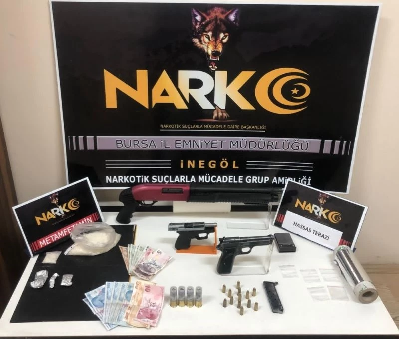 Edinilen bilgilere göre, İnegöl Narkotik Suçlarla Mücadele Grup Amirliği ekiplerince uyuşturucu madde ticareti yaptıkları belirlenen şahıslar takibe alındı. Düzenlenen operasyonda ekipleri fark eden şahıslar kaçmaya çalışırken yakalandı. Ekiplerin şahısların mesken tutukları yer ve araç içerisinde yapılan aramalarda; toplam 241,09 gram metamfetamin maddesi, 1 adet hassas terazi, uyuşturucu paketlemede kullanılan boş kilitli poşetler ve alüminyum folyolar, uyuşturucu ticaretinden kazanıldığı düşünülen 830 TL para, 2 adet ruhsatsız silah ve silaha ait 12 adet 9 mm mermi, 1 adet ruhsatsız pompalı tüfek ve tüfeğe ait 4 adet mermi ele geçirildi.