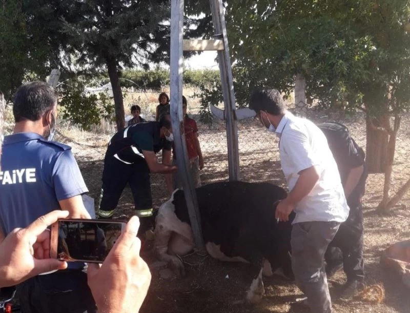 Adıyaman’da elektrik direğinin arasına sıkışan inek, itfaiye ekiplerinin direği ikiye ayırmasıyla kurtarıldı.