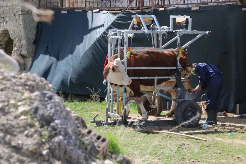 Elazığ’da büyükbaş hayvanların tırnak kesim ve bakımları, özel olarak hazırlanan seyyar araçla veteriner hekim tarafından köy köy gezilerek yapılıyor.