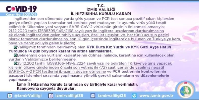 İzmir Valiliğinden yapılan açıklamada, İngiltere’den son dönemde yurda giriş yapan ve PCR test sonucu pozitif çıkan kişilerden geriye dönük yapılan taramalar neticesinde yeni mutasyon ile uyumlu virüs yükünün tespit edildiği belirtilirken, Türkiye’ye yeni varyant SARS-CoV-2 girişinin önlenmesi amacıyla İngiltere’den gelen uçuşların durdurulduğu hatırlatıldı. Bu kapsamda, İl Hıfzıssıhha Kurulunun yaptığı toplantıda alınan karar Valiliğin sosyal medya hesabından duyuruldu. Açıklamada, "Son 10 gün içerisinde İngiltere’de bulunan ve Türkiye’ye kara, hava ve deniz yoluyla gelen kişilerin, valiliğimiz tarafından belirlenmiş olan KYK Buca Kız Yurdu ve KYK Gazi Ayşe Hatun Yurdunda 14 gün boyunca karantina altına alınmalarına, belirlenmiş olan yurtların kapasitesinin dolması halinde, karantina için kullanılacak olan yurtların Valiliğimizce belirlenmesine ve Türkiye’ye giriş yapacak kişilerin ülkeye girişlerinde önceki son (72) saat içerisinde yapılmış negatif SARS-CoV-2-PCR testlerini ibrazının devam etmesine ve PCR testlerinin kontrollerinin pasaport işlemleri sırasında yapılmasına yönelik gerekli çalışmaların ve düzenlemelerin yapılmasına karar verilmiştir" denildi.