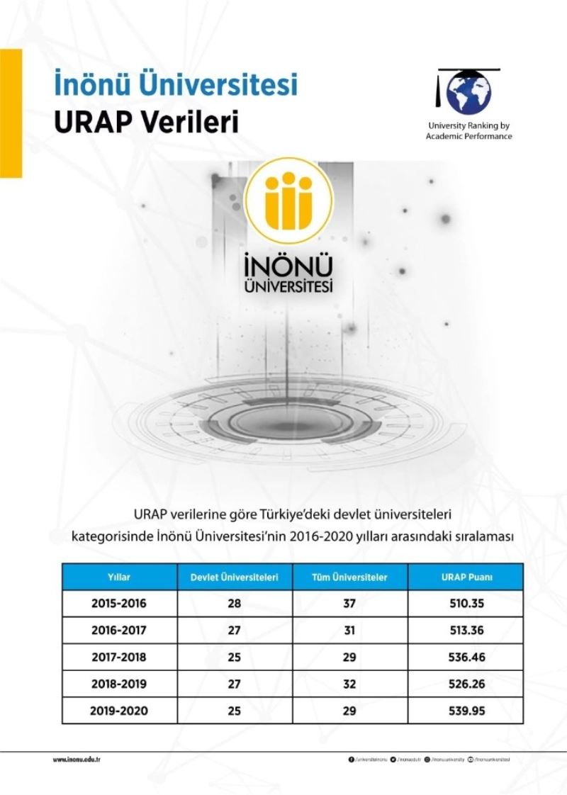 İnönü Üniversitesi’nin URAP verileri son 5 akademik yılda, devlet üniversiteleri arasında, 2015-2016 akademik yılı 28.sıra, 2016-2017 akademik yılı 27.sıra, 2017-2018 akademik yılı 25.sıra, 2018-2019 akademik yılı 27.sıra ve 2019-2020 akademik yılı 25.sıra olduğu kaydedildi.