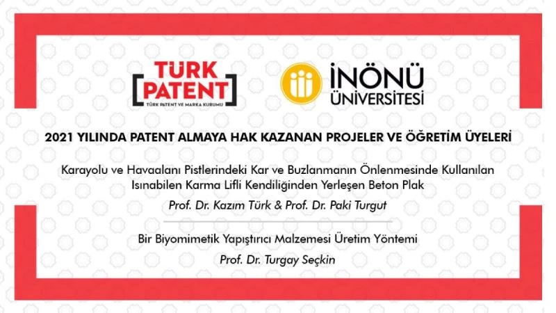 İnönü Üniversitesi Kimya Bölümü Öğretim Üyesi Prof. Dr. Turgay Seçkin’in “Bir Biyomimetik Yapıştırıcı Malzemesi Üretim Yöntemi” başlıklı buluşu incelemeli olarak patent alırken, İnşaat Mühendisliği Bölümü öğretim üyeleri Prof. Dr. Kazım Türk ve Prof. Dr. Paki Turgut’un “Karayolu ve Havaalanı Pistlerindeki Kar ve Buzlanmanın Önlenmesinde Kullanılan Isınabilen Karma Lifli Kendiliğinden Yerleşen Beton Plak” başlıklı buluşu ise Patent Belgesi almayı başardı.