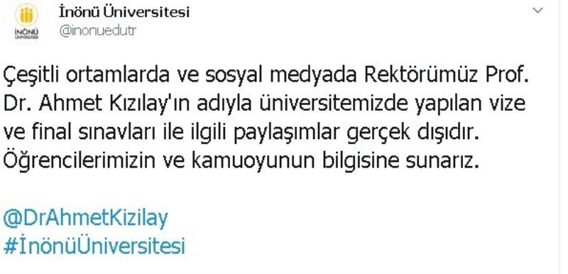 İnönü Üniversitesi tarafından yapılan açıklamada da, “ Çeşitli ortamlarda ve sosyal medyada Rektörümüz Prof. Dr. Ahmet Kızılay’ın adıyla üniversitemizde yapılan vize ve final sınavları ile ilgili paylaşımlar gerçek dışıdır. Öğrencilerimizin ve kamuoyunun bilgisine sunarız. Bu yalan ve gerçekdışı paylaşımı yapanlar hakkında gerekli yasal işlemler başlatılacaktır” ifadelerine yer verildi.