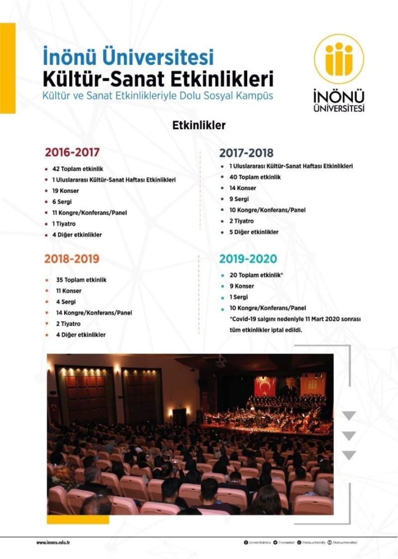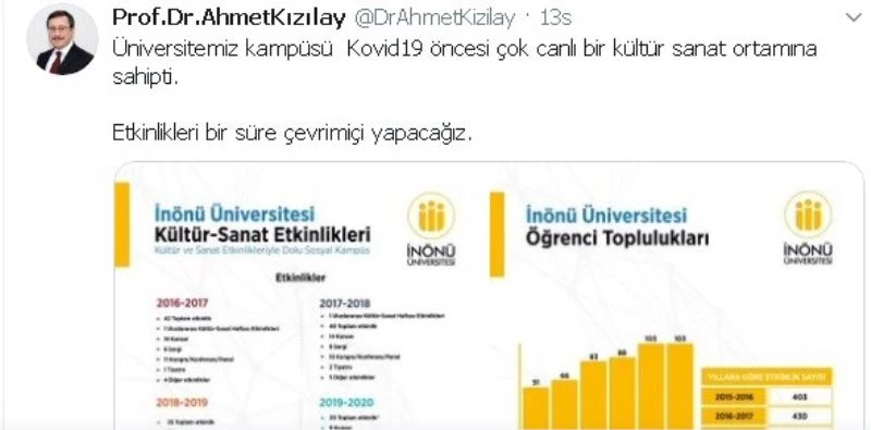 Rektör Kızılay, 2016-2020 arasında üniversitede yapılan etkinlikleri sosyal medya hesabında paylaşıp, "İnönü Üniversitesi kültür sanat etkinleriyle sosyal kampüs” ifadelerini kullandı.