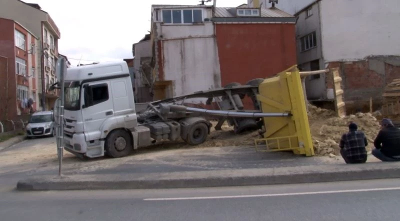 Arnavutköy’de bir inşaattan hafriyat almaya gelen kamyon, devrildi. Olay nedeniyle cadde trafiğe kapatıldı.