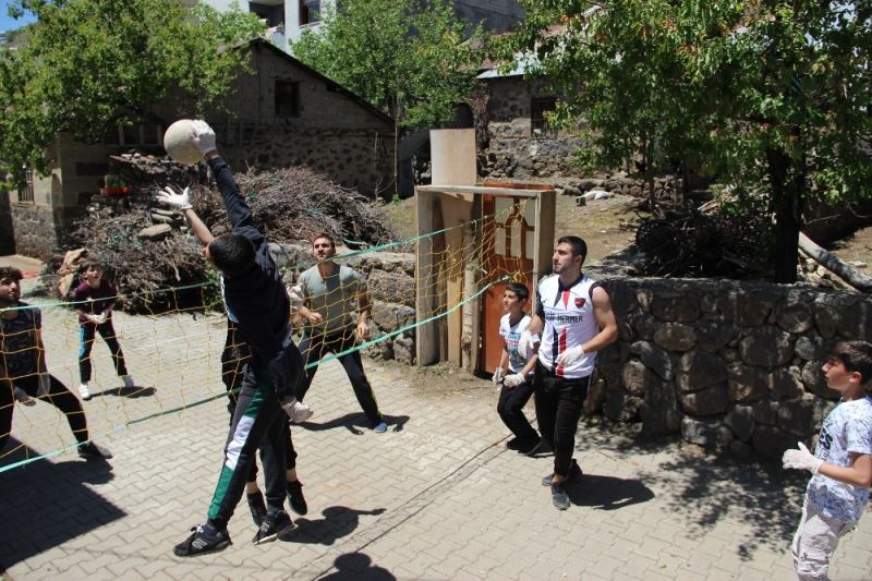 Bingöl’de çocuklar, kendi imkanlarıyla inşaat ipiyle file örüp, futbol topu ile voleybol oynadı.