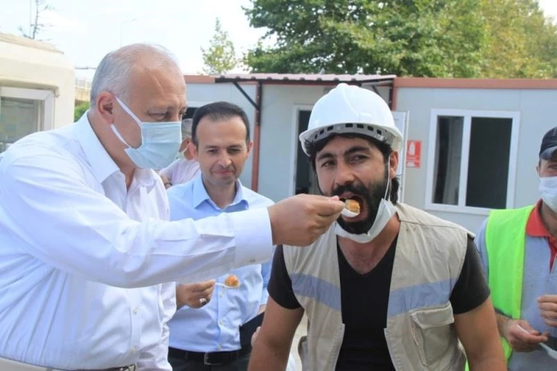 İnşaat işçilerine tatlı ikram eden ve birer tişört hediye eden Çebi ve Karaca işçilerle hatıra fotoğrafı çektirdi.