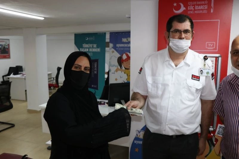Samsun Valiliği İl Göç İdaresi’nde çalışan güvenlik görevlisi Osman Poyraz, bu sabah 10.30 sıralarında masanın yanında bir el çantası tespit etti. Çantayı kamera önünde kontrol eden Poyraz, çantada 85 adet 100 ABD doları, 185 adet 200 TL ve 20 adet de 50 TL olduğunu gördü. Para ve çantayı kurumdaki idari işler müdürlüğüne teslim etti. Birkaç saat sonra İl Göç İdaresi’ne gelerek çantasını kaybettiğini söyleyen Irak uyruklu Asmaa Mosleh Khalaf Al Obaidi (43), paralarının olduğu çantanın burada olduğunu öğrenince çok sevindi.