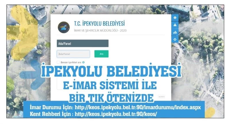 E-imar uygulaması ile 7 gün 24 saat güncel imar planına ücretsiz erişim, ada etüt sınırlarında ada etüt raporlarına erişim, parsele ait cephe ve derinlik bilgilerinin plan üzerinden hesaplanması, varsa kamusal alanlara terk miktarının hesaplanması, imar planı ve uydu görüntüsünü, aynı altlıkta görüntüleyebilme imkânlarının vatandaşlara sunulmasının hedeflendiği sisteme ise imar durumu için http://keos.ipekyolu.bel.tr:90/imardurumu/index.aspx, kent rehberi için de http://keos.ipekyolu.bel.tr:90/keos/ adreslerinden erişim sağlanabileceği bildirildi.