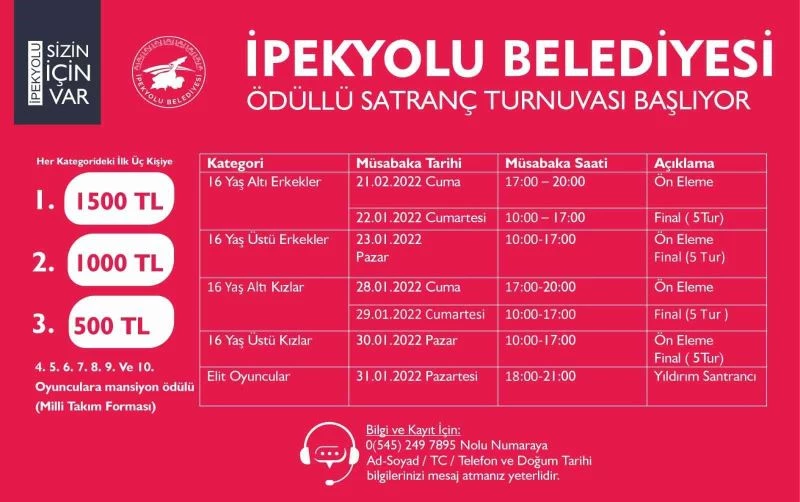 İpekyolu Belediyesine bağlı Gençlik ve Spor Hizmetleri Müdürlüğü tarafından organize edilen “Satranç Turnuvası” 21 Ocak 2022 Cuma günü İpekyolu Atatürk Sanat Galerisi’nde düzenlenecek. Turnuvaya başvurular 06 -19 Ocak 2022 tarihleri arasında alınacak. Turnuva 16 yaş ve üzeri kadınlar-erkekler, 16 yaş altı kadınlar- erkekler, elit oyuncular şeklinde üç ayrı kategoride ayrı ayrı düzenlenecek. Her kategoride birinciye bin 500 TL, ikinciye bin TL, üçüncüye ise 500 TL para ödülü verilecek. Ayrıca ilk 10’a kalan yarışmacılara ise Milli Takım Forması hediye edilecek.