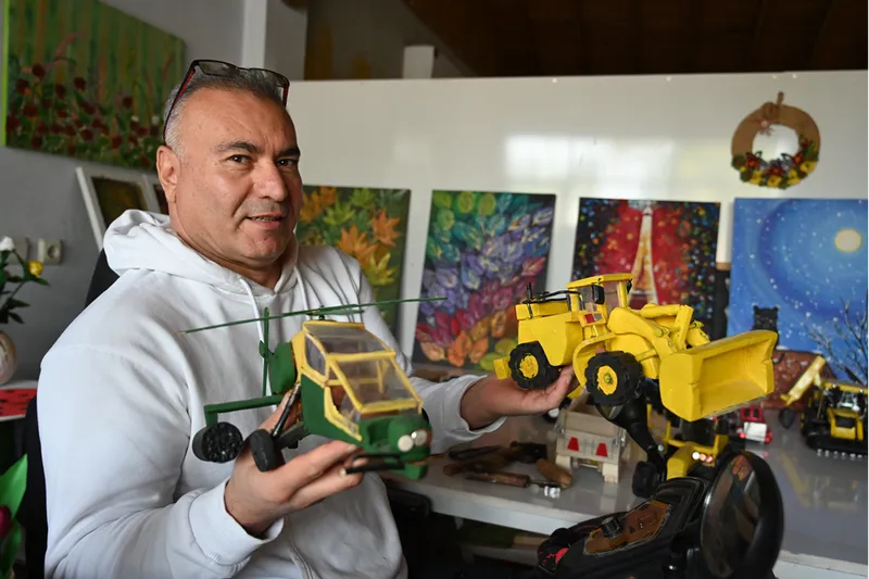 İkametinin bir köşesini atölyeye çeviren Yiğit, ağaç kabuğu ve tahta parçalarından traktör, biçerdöver, kepçe, kamyon ve helikopter şeklinde oyuncaklar tasarlıyor.