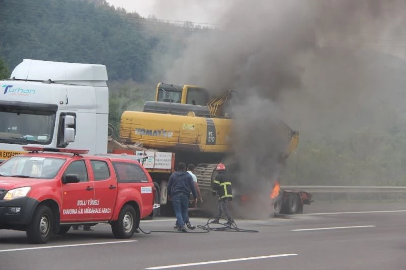 Olay öğlen saatlerinde TEM otoyolu Kaynaşlı mevki’inde meydana geldi. Ankara’dan İstanbul istikametine gitmekte olan Arif Aydın idaresinde ki 34 HN 7583 plakalı Renault marka iş makinesi yüklü tır çekicisinin lastikleri bir anda alev aldı. Tır’dan çıkan dumanları gören sürücü aracı sağ şeride çekti. Trafikte seyir halinde olan kamyoncularda durarak yangın tüpleri ile müdahale etti. Olay yerine gelen Bolu Dağı Tünel İtfaiye ekiplerinin köpük sıkması sonucunda yangın kontrol altına alınarak söndürüldü. Yangın nedeniyle kısman kapanan yol söndürülmesinin ardından tekrar trafiğe açıldı.