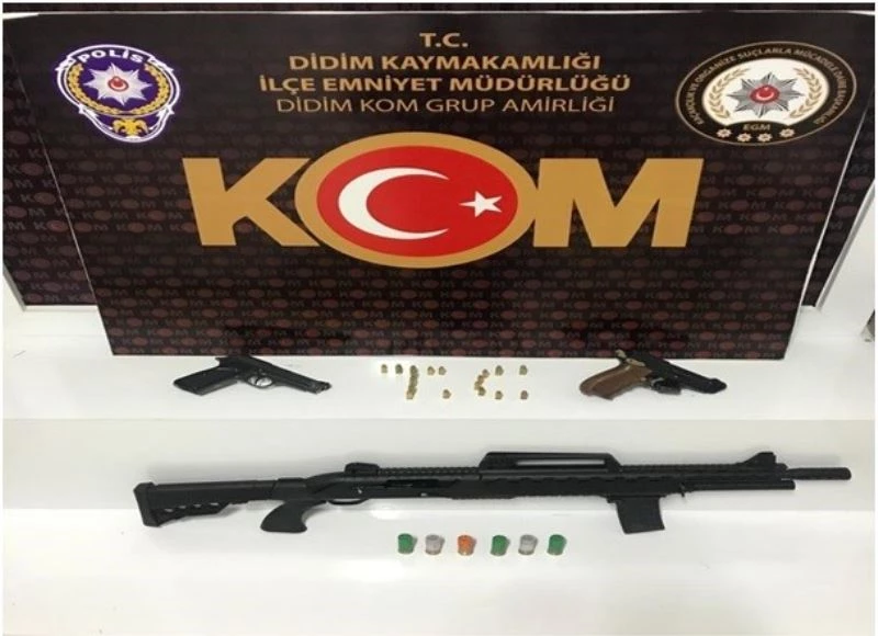 Edinilen bilgiye göre, Aydın İl Emniyet Müdürlüğü, Didim İlçe Emniyet Müdürlüğü Kom Grup Amirliği ekiplerince bir işyerinde arama yapıldı. Yapılan aramada, 2 adet tabanca ve tabancalara ait 2 adet şarjör, 1 adet av tüfeği ve 1 adet av tüfeği şarjörü, 18 adet tabanca mermisi, 6 adet av tüfeği kartuşu ele geçirildi. İş yerinde bulunan Ö.U.B. ve M.K. isimli şahıslar hakkında adli işlem başlatıldı.