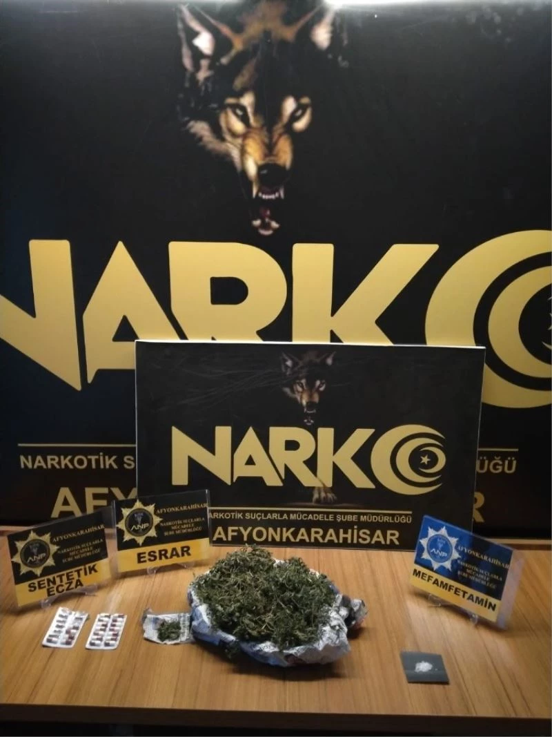 Afyonkarahisar İl Emniyet Müdürlüğü ekipleri tarafından yapılan çalışmalar sonucu, kent merkezi Yenice Mahallesinde faaliyet gösteren bir iş yerinde arama yapıldı. Aramalarda; 200 gram esrar maddesi, 19 adet gerica 300 miligram ibareli yeşil reçeteye tabi sentetik ecza, 0,88 gram metamfetamin maddesi ele geçirildi.