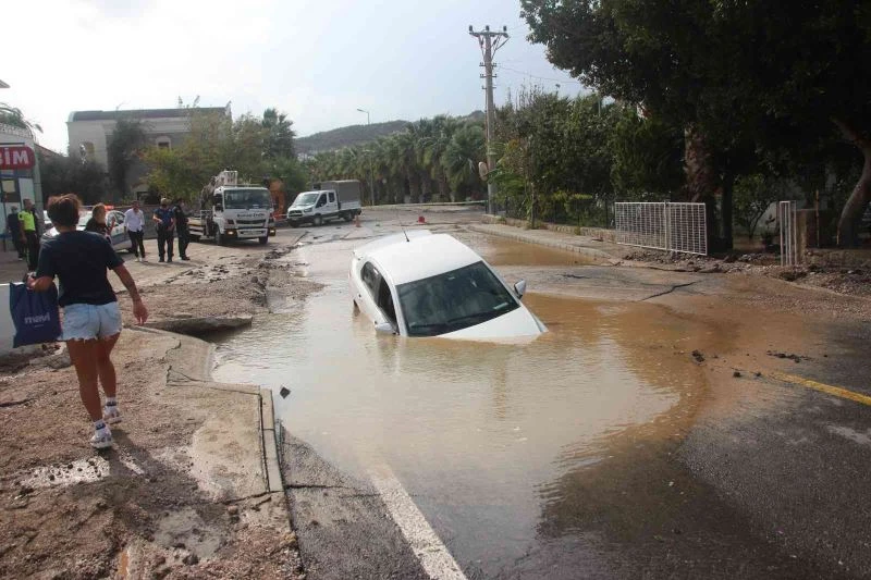 Muğla’nın Bodrum ilçesinde patlayan isale hattı sonrası yol çöktü, cadde ve sokaklar göle döndü. Yolda oluşan çukura giren otomobildeki 2 kişi kurtarıldı.