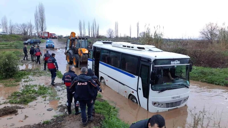Manisa’nın Turgutlu ilçesinde etkili olan sağanak nedeniyle su seviyesi yükselen Karacaali Deresinde mahsur kalan işçi servisindeki 18 kişi kurtarıldı. AFAD ve itfaiye ekipleri iş makineleri yardımıyla önce işçiler tahliye edildi, ardından da işçi servisi kurtarıldı.