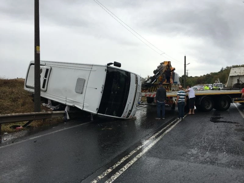 Çorlu’da yağış nedeniyle kayganlaşan yolda sürücünün kontrolünden çıkan işçi servisi bariyere çarparak yan yattı. Elektrik direğine yaslanarak devrilmeden duran servisteki işçilerden 10’u yaralandı.