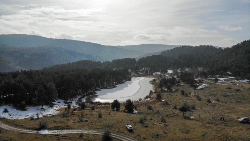 Başkent’in Kızılcahamam ilçesinde bulunan Karagöl, hava sıcaklığının sıfırın altına düşmesiyle dondu. Işık Dağı eteklerindeki gölün buzla kaplanmasıyla ortaya seyrine doyum olmayan bir manzara çıktı, görsel şölen havadan görüntülendi.