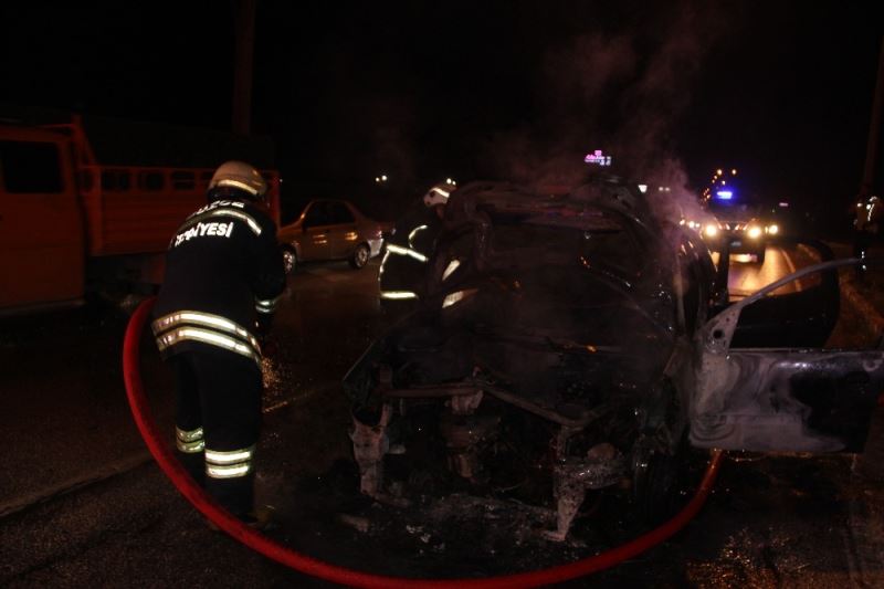 100 Karayolu Çerkez Taşköprü kavşağında kırmızı ışıkta bekleyen otomobil bir anda alev aldı. Yangın kısa sürede söndürülürken araç küle döndü.