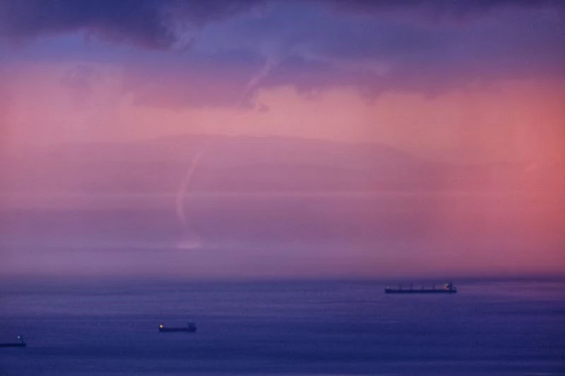 İskenderun körfezinde gün batımıyla birlikte yağmur ve hortum manzaraları kartpostallık görüntüler oluşturdu.