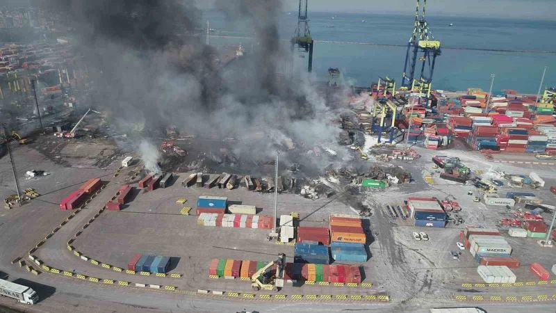 Türkiye’nin dördüncü büyük limanı olan İskenderun Limanı’nda devrilen konteynerlerden başlayan yangın 3’üncü gününde kontrol altına alınırken havadan görüntülendi.