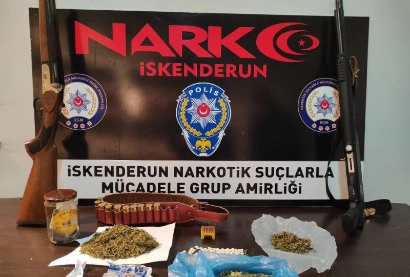 Edinilen bilgiye göre, İskenderun Emniyet Müdürlüğü Narkotik Suçlarla Mücadele Grup Amirliği ve İstihbarat Büro Amirliği ekiplerince koordineli olarak uyuşturucu veya uyarıcı madde ticareti yapan şahıslara yönelik yaptıkları çalışmalarda belirlenen 4 adreste gerçekleştirilen aramada, K.E. isimli şahsın ikametinde 59,5 gram uyuşturucu esrar maddesi, 148 adet Captagon hap, 1 adet pompalı tüfek, A.S. isimli şahsın ikametinde 13 adet Captagon hap, M.A.S. isimli şahsın ikametinde 48 gram uyuşturucu esrar maddesi, A.D. isimli şahsın ikametinde 1 adet tüfek, 1 adet fişeklik, 21 adet kartuş, 25 adet 6,35 çapında fişek ele geçirildi.