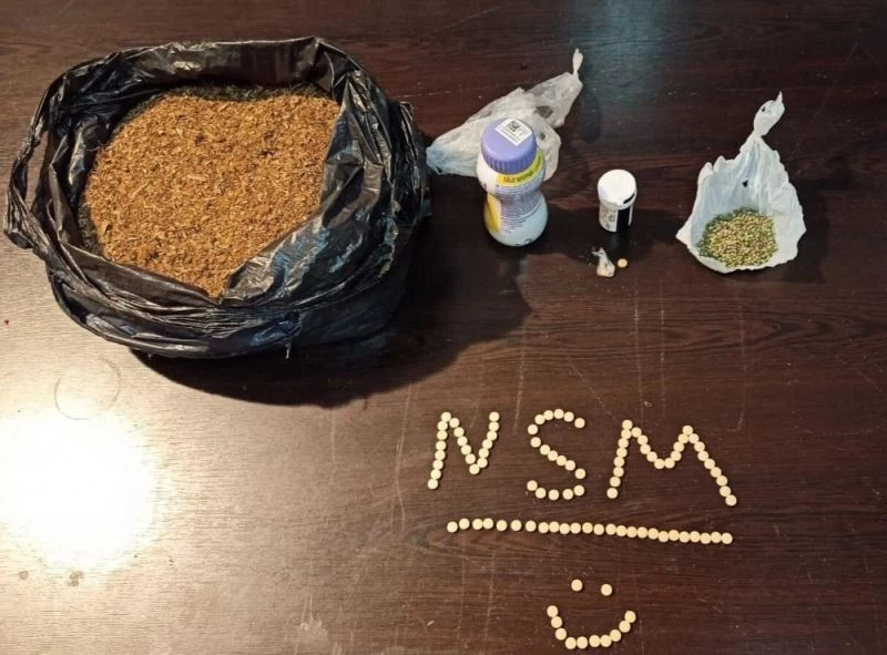 Yapılan aramada; 1 adet siyah poşet içerisinde 1 kilo 550 gram Sentetik Kannabınoıd, mor kapaklı plastik kutu içerisinde 99 adet, cam şişe içerisinde 2 captagon ve extacy hap ile hint keneviri tohumu ele geçirildi.