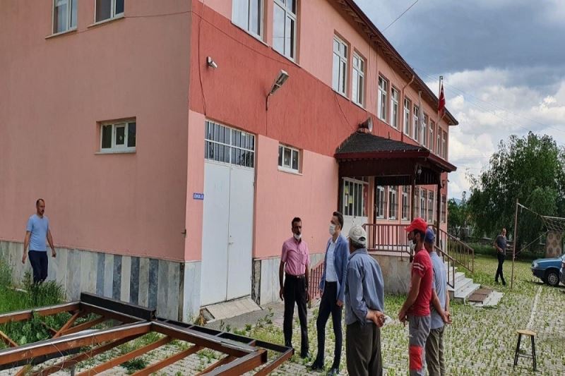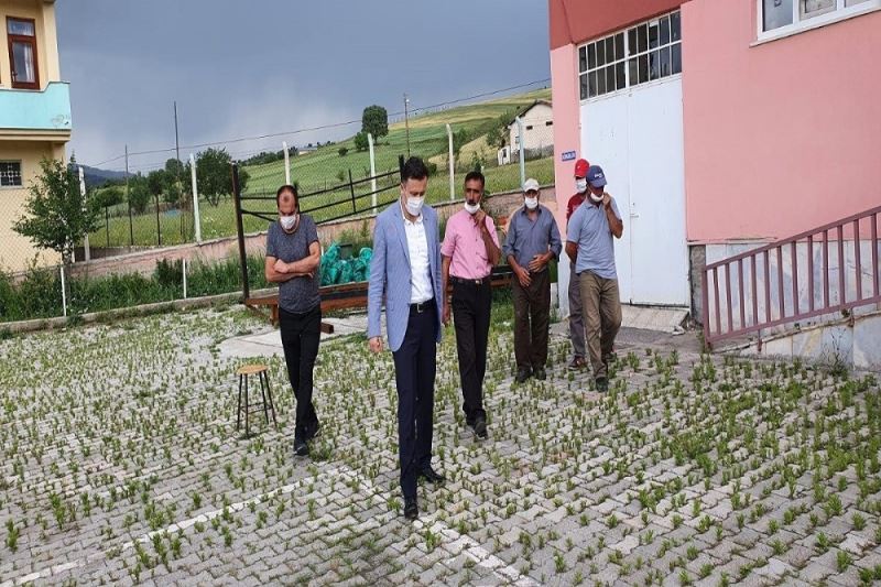 Depreme dayanaksız olduğu tespit edilen Kurusaray Ortaokulu binasının yıkılması nedeniyle öğrencilerin yeni eğitim göreceği Kuzköy Ortaokulunda da incelemelerde bulunan Eligül, köy muhtarı ve işçilerden bilgiler aldı.