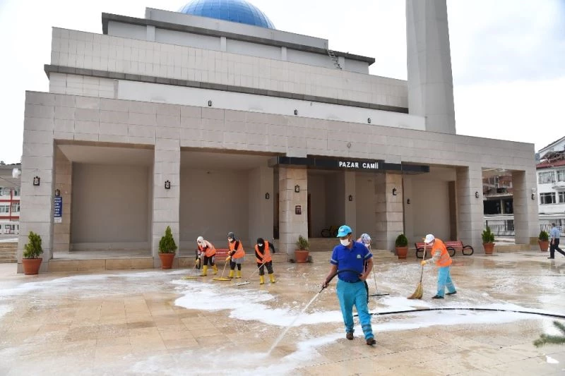 Korona Virüsü tedbirleri kapsamında uzun bir süredir kapalı olan camiler yarın Cuma Namazı ile birlikte ibadete açılıyor. Isparta’da valilik ve müftülükçe belirlenen şartlara uygun olan camilerde kılınacak olan Cuma Namazı öncesinde Isparta Belediyesi tarafından dezenfeksiyon çalışmaları gerçekleştirildi. Bu camilerden birisi de Isparta Belediye Başkanı Şükrü Başdeğirmen’in girişimleri ile yıllardır atıl vaziyette kalan ve 2019 Ramazan’ında Kadir Gecesinde ibadete açılan Isparta Ticaret ve Kültür Merkezi İnşaat alanı içerisinde kalan Pazar Cami oldu. Camide Temizlik İşleri Müdürlüğünce cami avlusu başta olmak üzere şadırvanları ve ortak kullanım alanları en ince ayrıntısına kadar dezenfeksiyon işlemlerinden geçirildi.