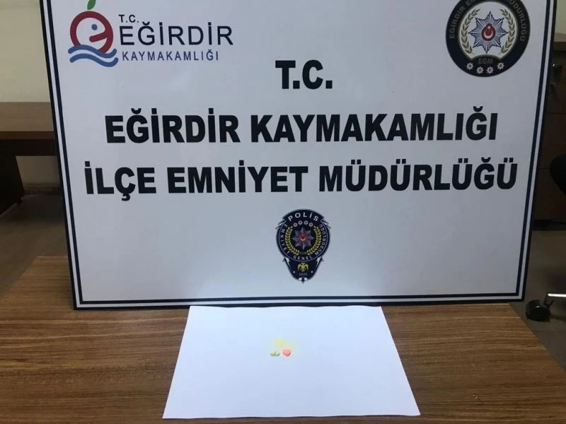 Olay, Eğirdir’de meydana geldi. Edinilen bilgiye göre, polis ekipleri tarafından Konya istikametine gitmekte olan 34 KC 2299 plakalı araç durduruldu ve araçtaki şahısların GBT sorguları yapıldı. Şüphe üzerine üstü aranan Murat K. isimli şahsın üzerinden, peçeteye sarılı kalp şeklinde 1 adet turuncu renkli uyuşturucu hap ve iki adet kırık sarı renkli uyuşturucu hap ele geçirildi. Haplara polis tarafından el konulurken, şüpheli Murat K. ise gözaltına alındı. Soruşturmanın sürdüğü bildirildi.